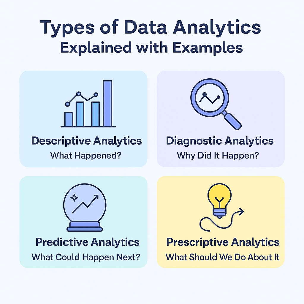 Now that you understand what is data analytics, it’s time to explore its four main types — each serving a unique purpose in uncovering insights from data.